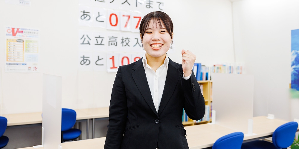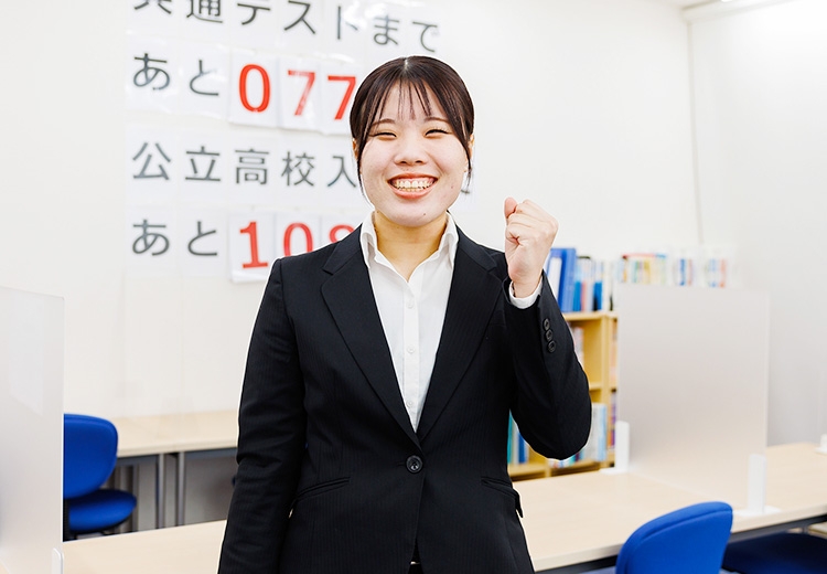 高校生時代に、同級生に勉強を教えることがあり、その時に褒められたことが印象に残っていました。そのため以前から塾講師をしてみたいと思っていたのですが、家庭の事情や自身の学業の忙しさから、経験できずにいました。3月に就職活動が終わり、時間に余裕ができたので、大学卒業前にやってみたかったお仕事をしようと思い、塾講師になりました。トライプラスを選んだ理由は、個別指導で、生徒一人ひとりに寄り添えると感じたから。私自身は中学・高校時代に集団指導塾に通っていたので、個別指導塾への興味もありました。講師経験がない私でしたが、先輩講師の方から丁寧な研修を受けられ、安心してお仕事を始めることができました。講師として生徒を受け持つようになった後も、教室長やほかの講師の方から、生徒の性格や得意不得意などを伺うことができ、またそれにどう対応したらいいのかについても相談できたので、不安はありませんでした。